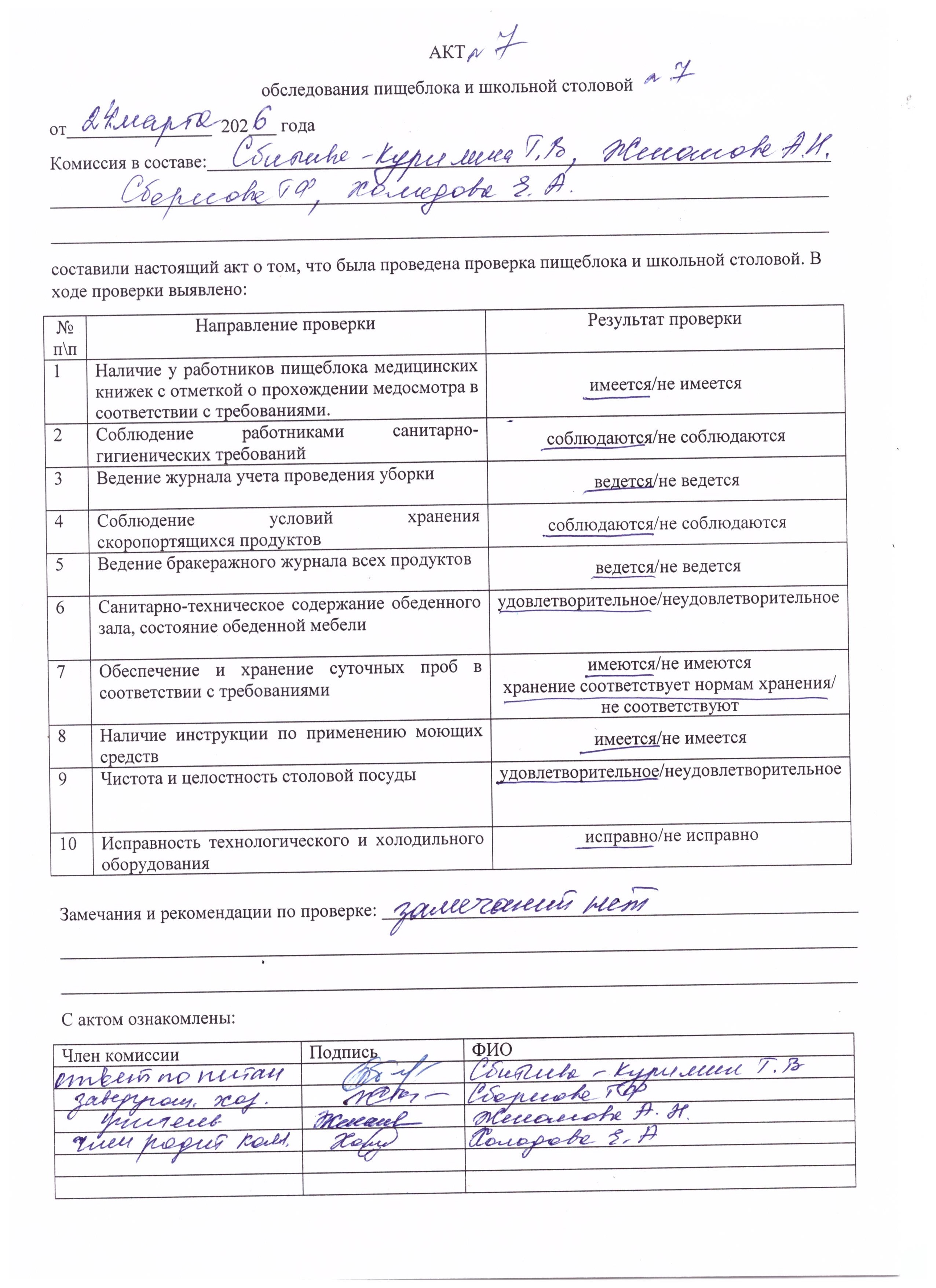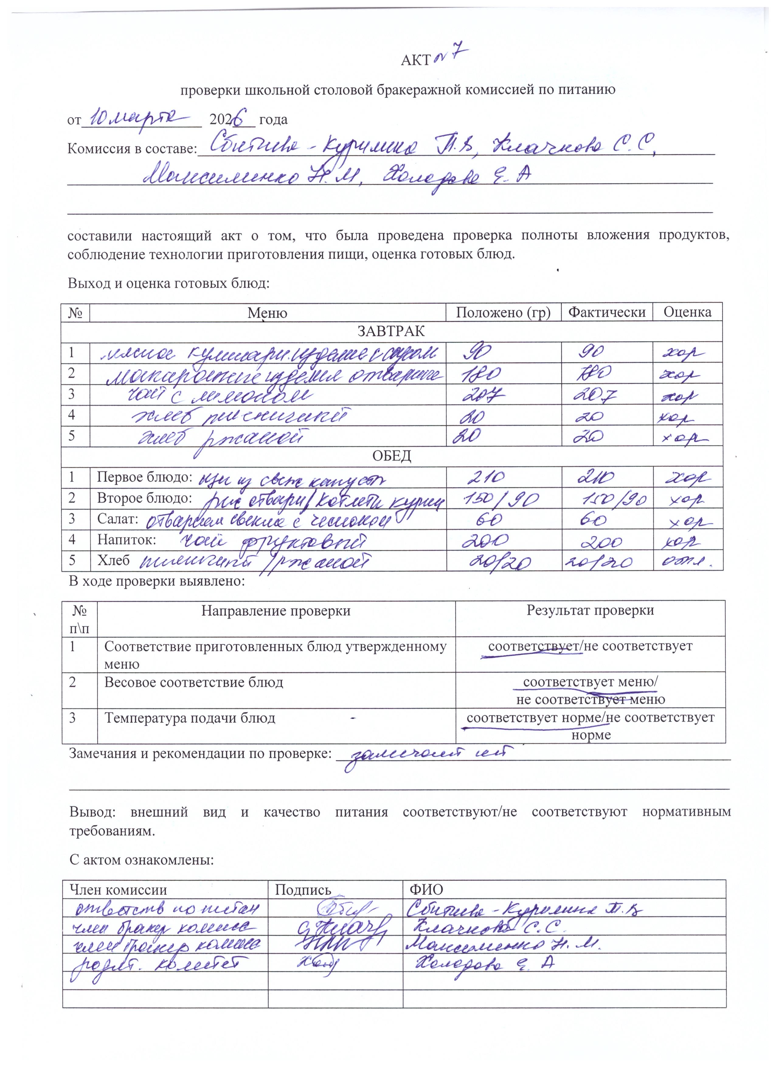 Акт проверки школьной столовой бракеражной комиссией по питанию Март 2026 г.