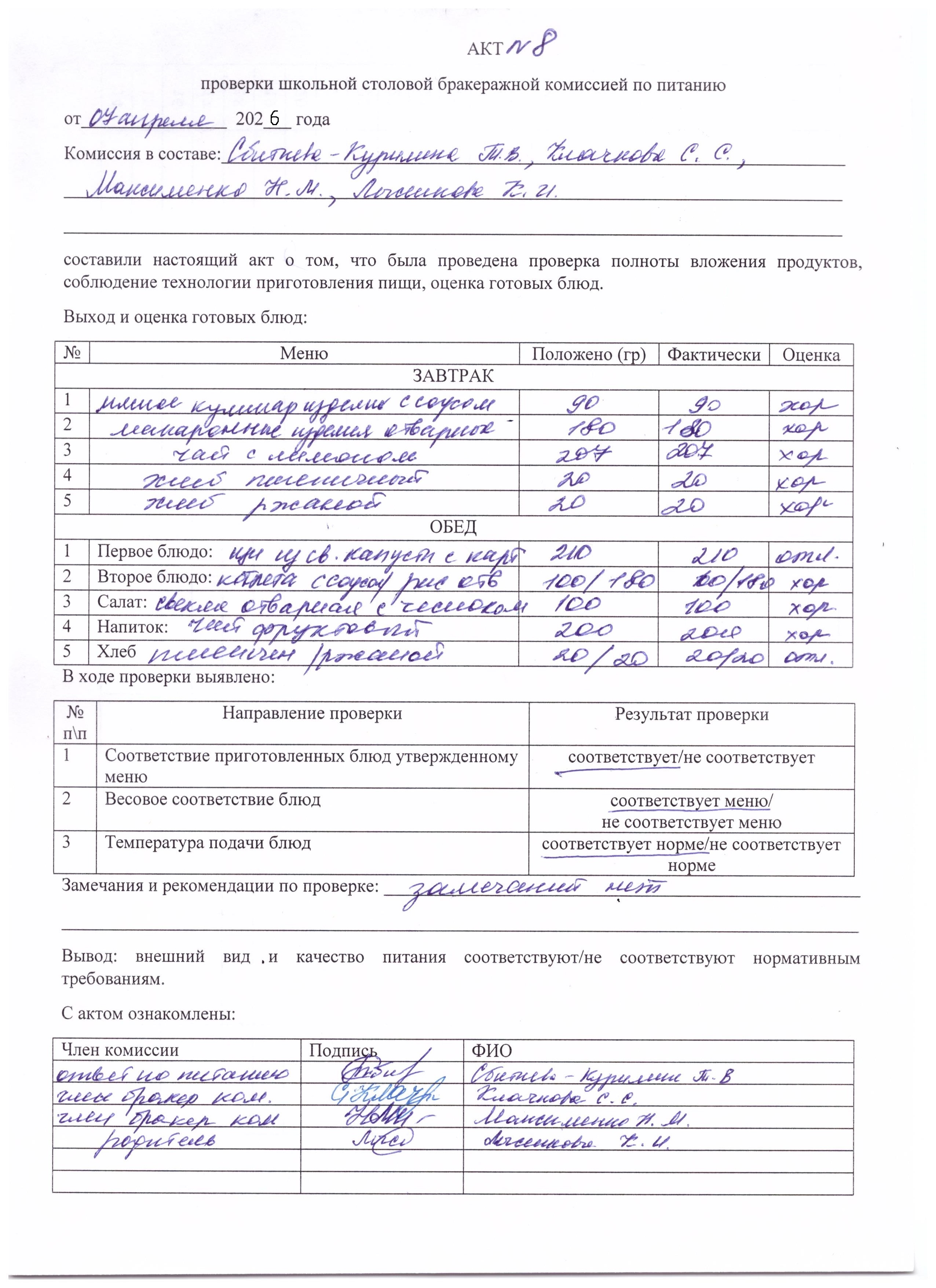 Акт проверки школьной столовой бракеражной комиссией по питанию Апрель 2026 г.