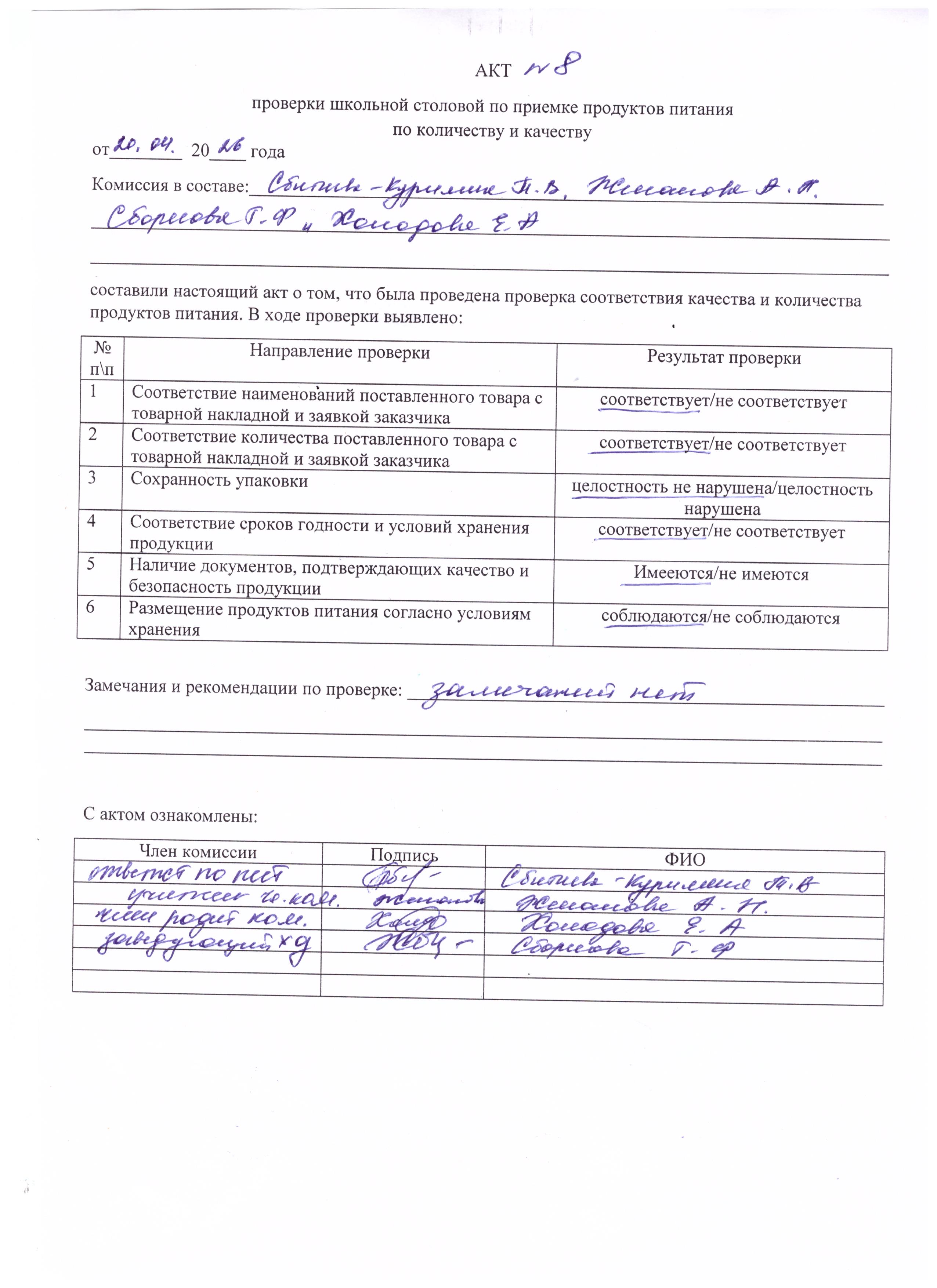 Акт проверки школьной столовой по приемке продуктов питания Апрель 2026 г.