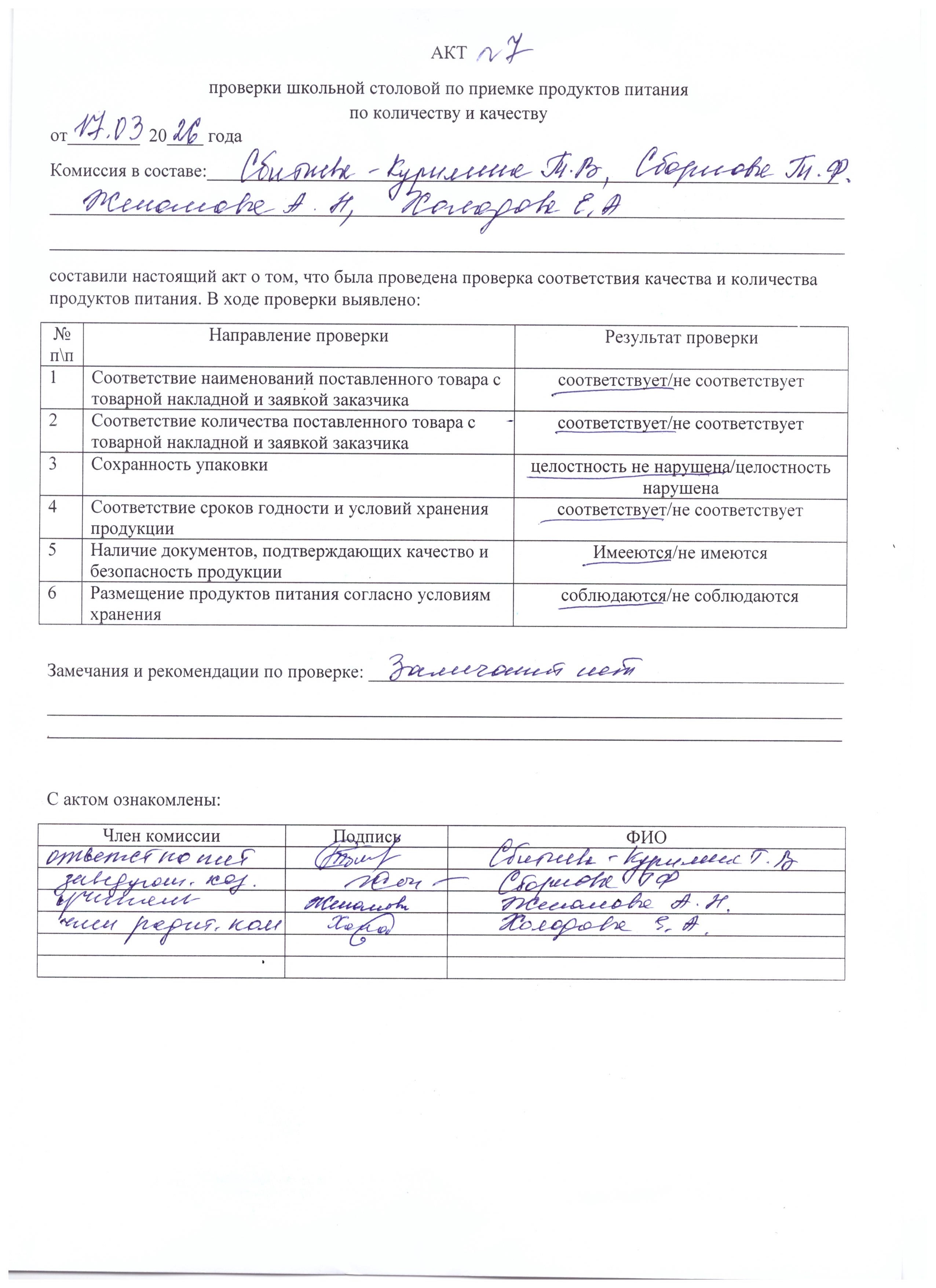 Акт проверки школьной столовой по приемке продуктов питания Март 2026 г.