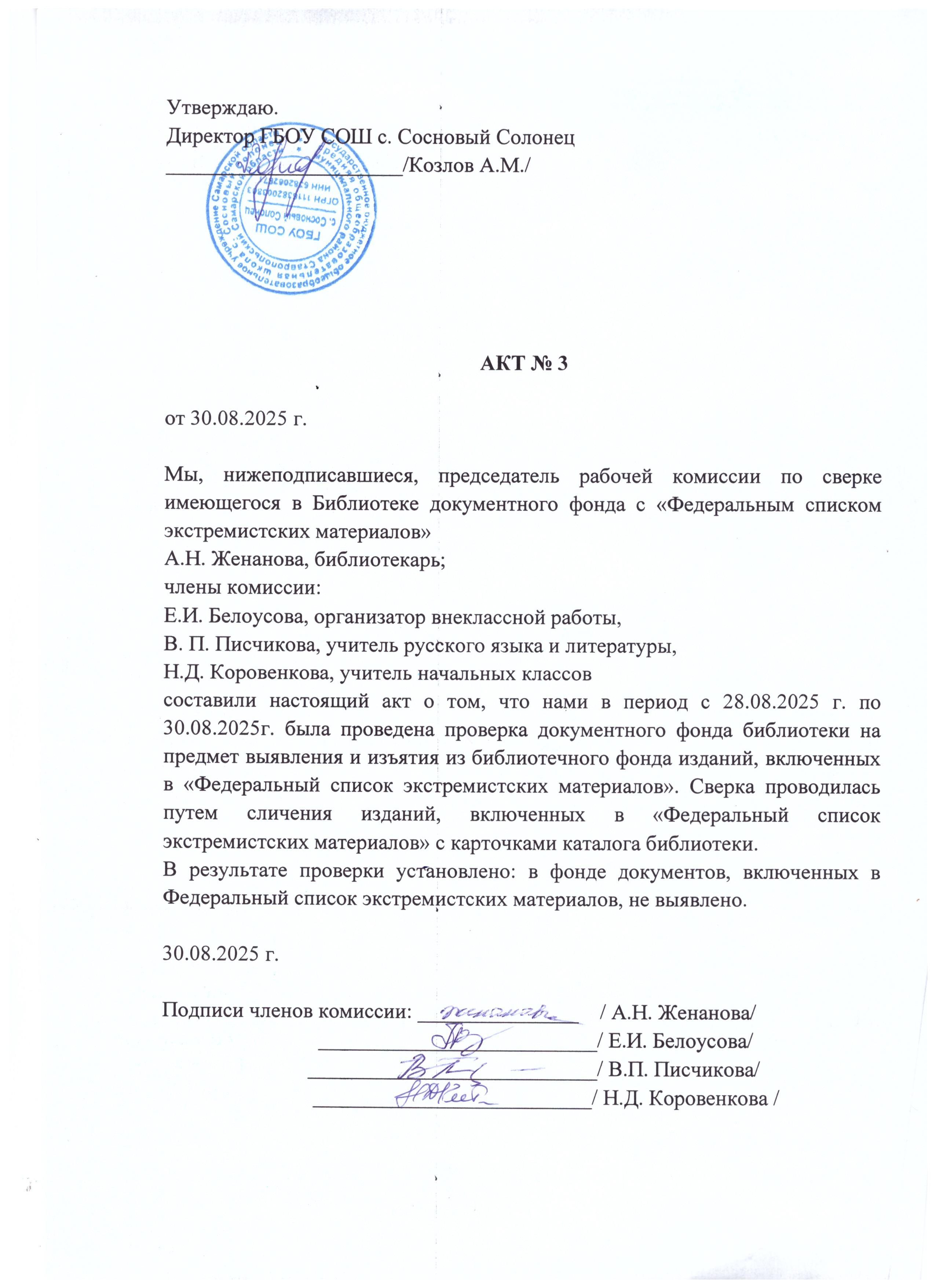 Акт сверки N 3 (от 30.08.2025) библиотечного фонда с «Федеральным списком экстремистских материалов»