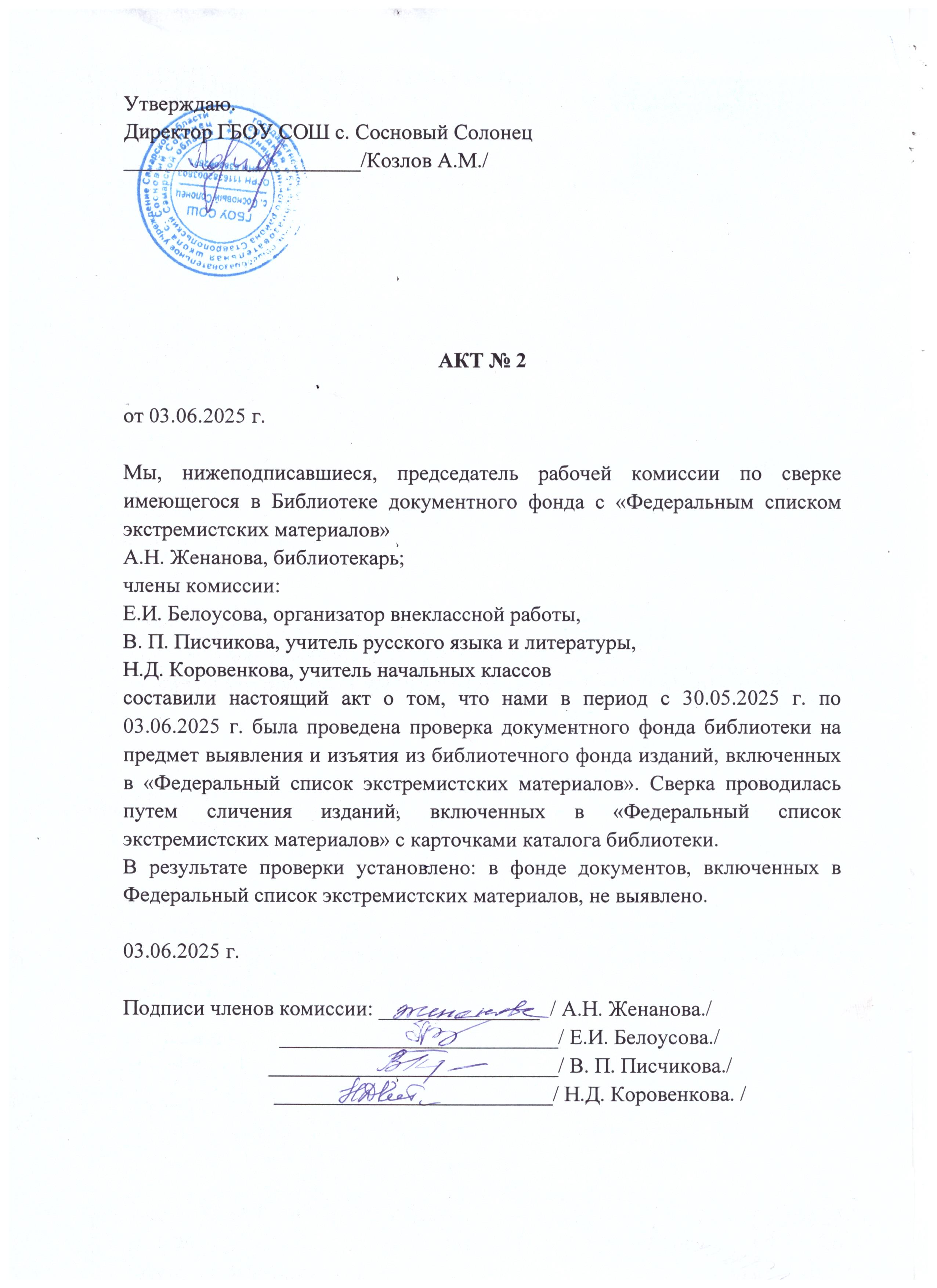 Акт сверки N 2 (от 03.06.2025) библиотечного фонда с «Федеральным списком экстремистских материалов»