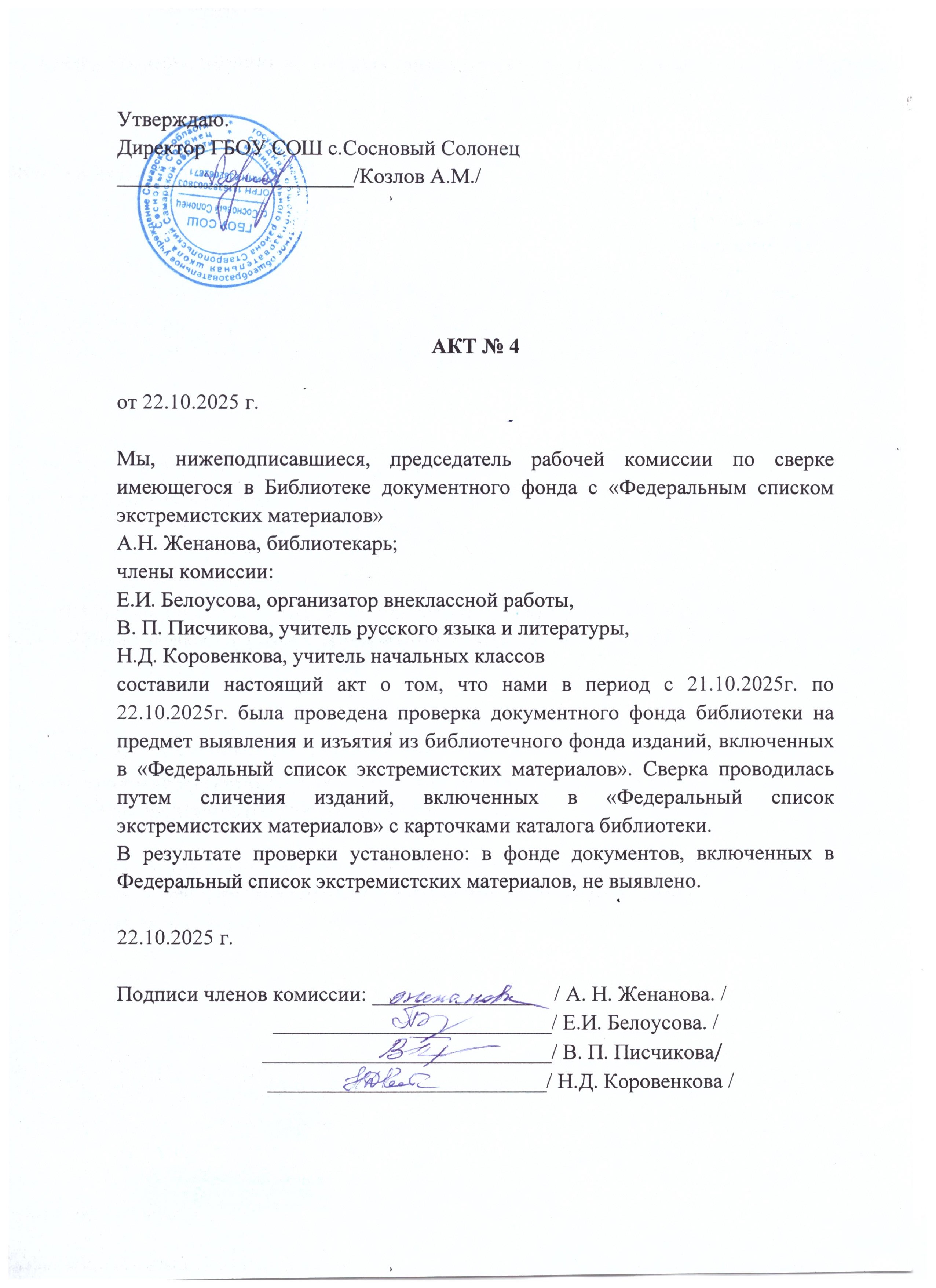 Акт сверки N 4 (от 22.10.2024) библиотечного фонда с «Федеральным списком экстремистских материалов»